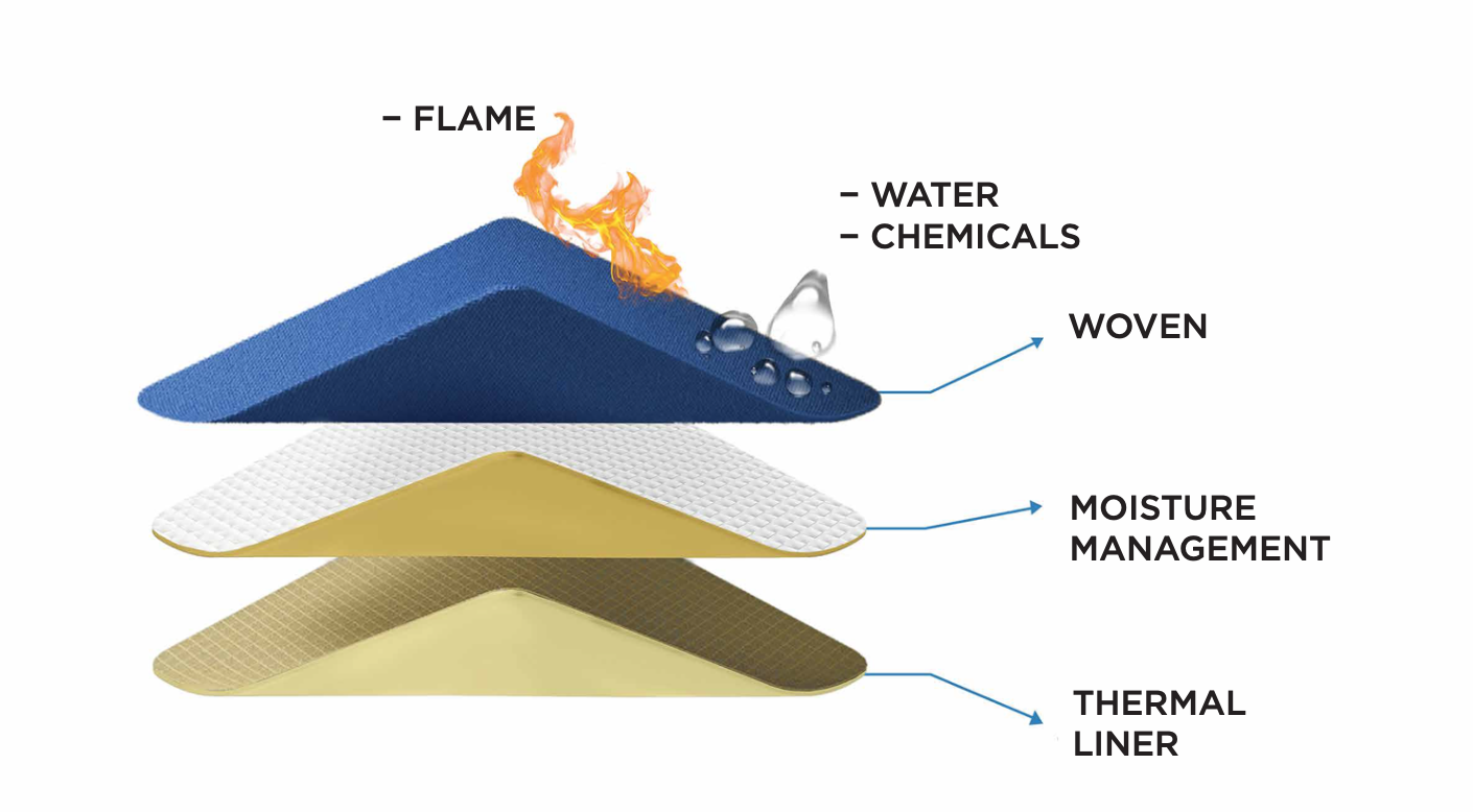 This is the innermost layer of the turnout gear’s composite system made out of inherent FR aramid fiber & blends hybrid technology (Needlepunch+Spunlace) in plain, aperture & 3D embossed structure. This high strength to weight ratio non-woven fabric layer provides better insulation and thermal resistance properties with excellent wash fastness making it an alternate option to commodity FR woven fabric.